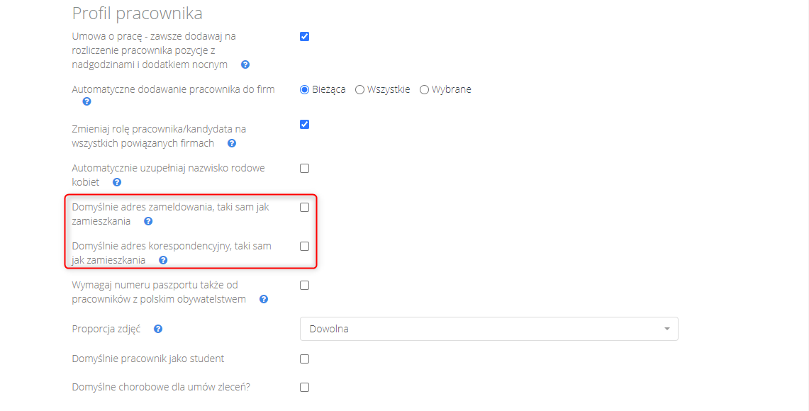 Zaznaczenie opcji spowoduje, że przy dodawaniu nowych pracowników/kandydatów, opcja “Taki sam jak zamieszkania” będzie zaznaczona.