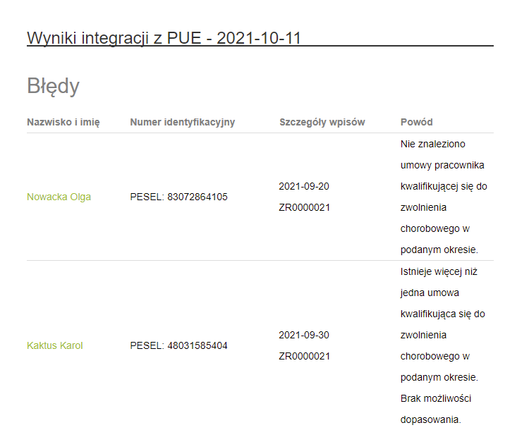 Błędy – w tej sekcji prezentowane są informacje o pracownikach, którym nie udało się zaimportować wpisów chorobowego ze względu na niepoprawne dane w systemie takie jak: