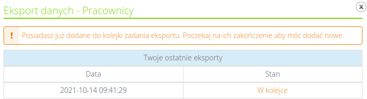 – gdy w kolejce znajduje się eksportowany plik, nie możemy eksportować kolejnego pliku z poziomu tej samej listy pracowników (należy zaczekać, aż kolejka wcześniej eksportowanego pliku się zakończy)