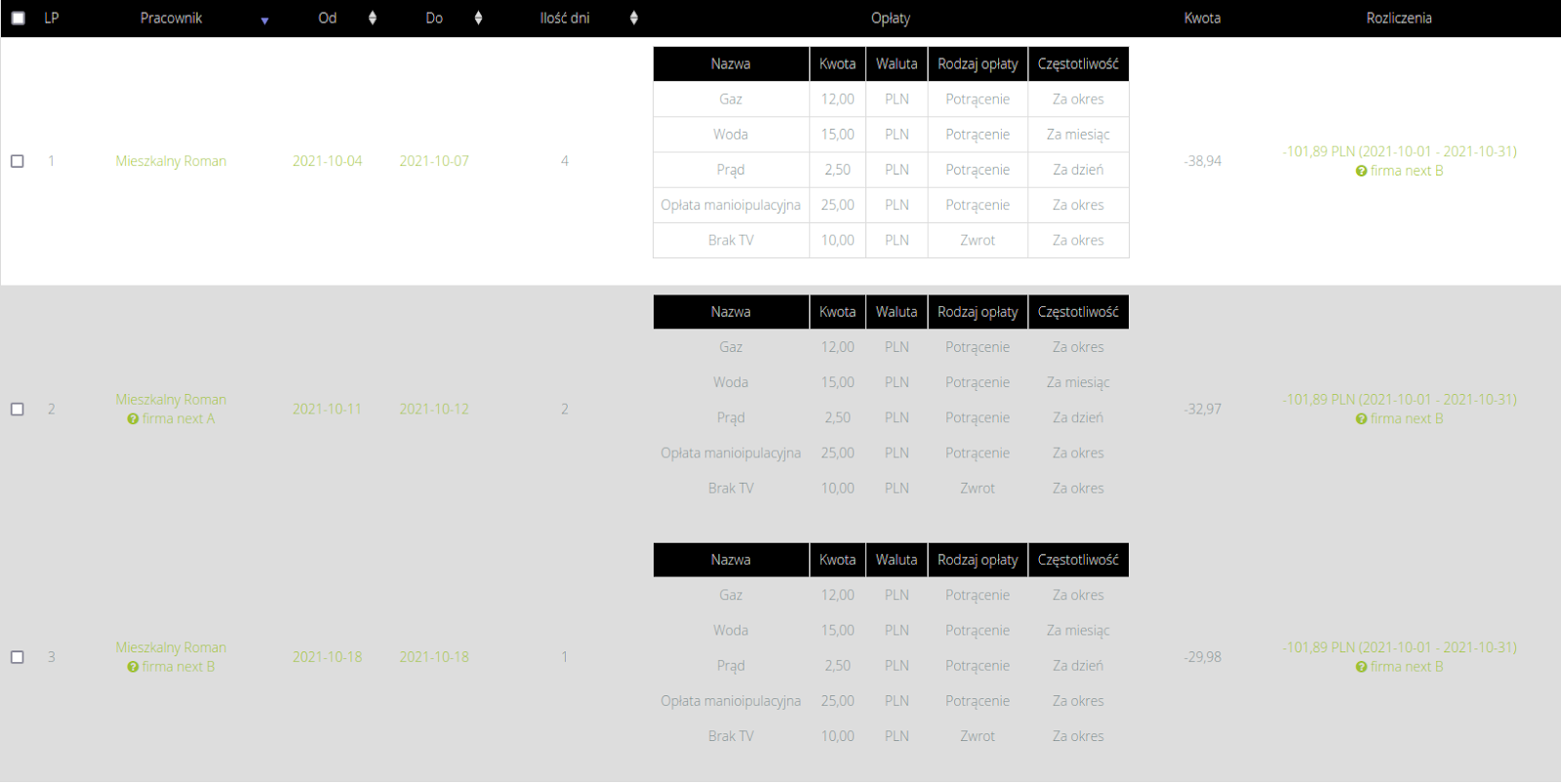 Po wejściu na wybranym mieszkaniu w Opłaty > Lokatorzy > Naliczenia pokazane będą naliczenia lokatorów z wpisów noclegu ze wszystkich firm, do których użytkownik ma dostęp. Kolumna “Rozliczenia” pokazuje informacje o rozliczeniu, gdy było zrobione na innej firmie (również widoczna jest nazwa tej firmy).