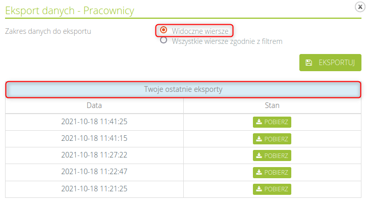 - opcja „Widoczne wiersze” umożliwia eksportowanie danych widocznych pracowników lub kandydatów