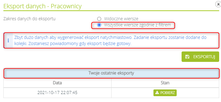 – w przypadku, gdy ilość eksportowanych wierszy jest mniejsza niż 50, zostaną one pobrane natychmiastowo, jeśli liczba eksportowanych wierszy jest większa niż 50, zadanie eksportu zostanie dodane do kolejki. Zostaniesz powiadomiony, gdy eksport będzie gotowy do pobrania (czas eksportowania zależy od ilości rekordów i może trwać 1-10 minut)
