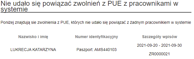 - znaleziono pracownika o podanym numerze PESEL/Paszport, ale Imię lub Nazwisko nie zgadza się (np. literówka)