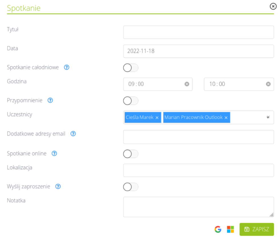 - Zaproszenie na spotkanie może zostać wysłane zarówno do użytkowników systemu Faktura.pl, jak i osób spoza systemu – pole “Dodatkowe adresy email”.
