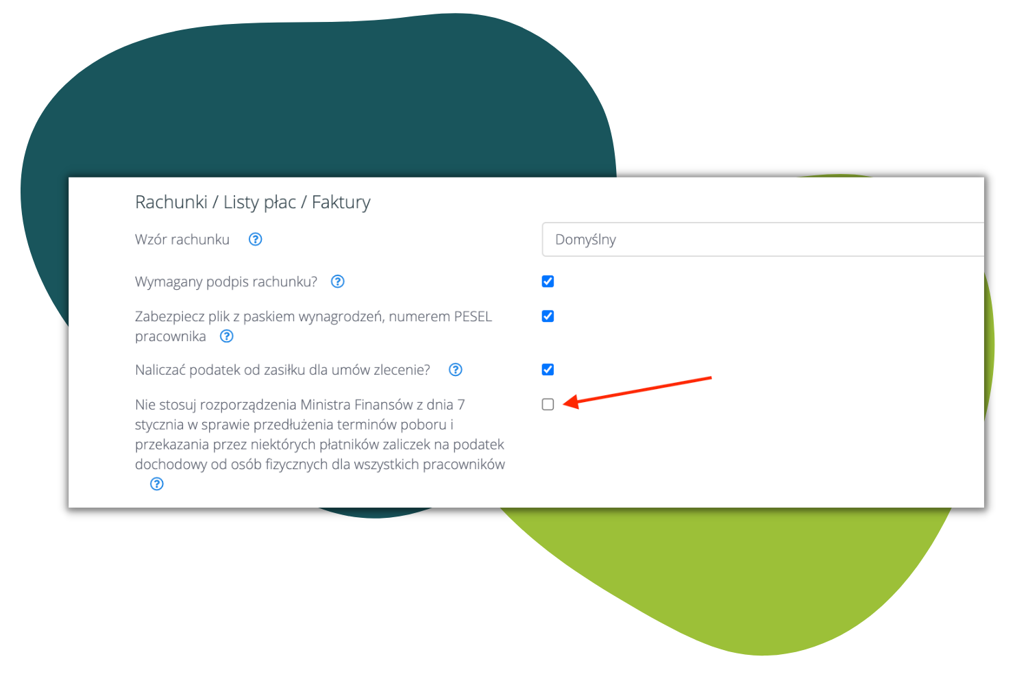 W Pracownicy > Lista pracowników > Dowolny Pracownik > Dane > Dane do rozliczeń > Zaliczka na podatek > Pozostałe ustawienia, pojawiła się opcja „Nie stosuj rozporządzenia Ministra Finansów z dnia 7 stycznia w sprawie przedłużenia terminów poboru i przekazania przez niektórych płatników zaliczek na podatek dochodowy od osób fizycznych dla wybranych firm”.