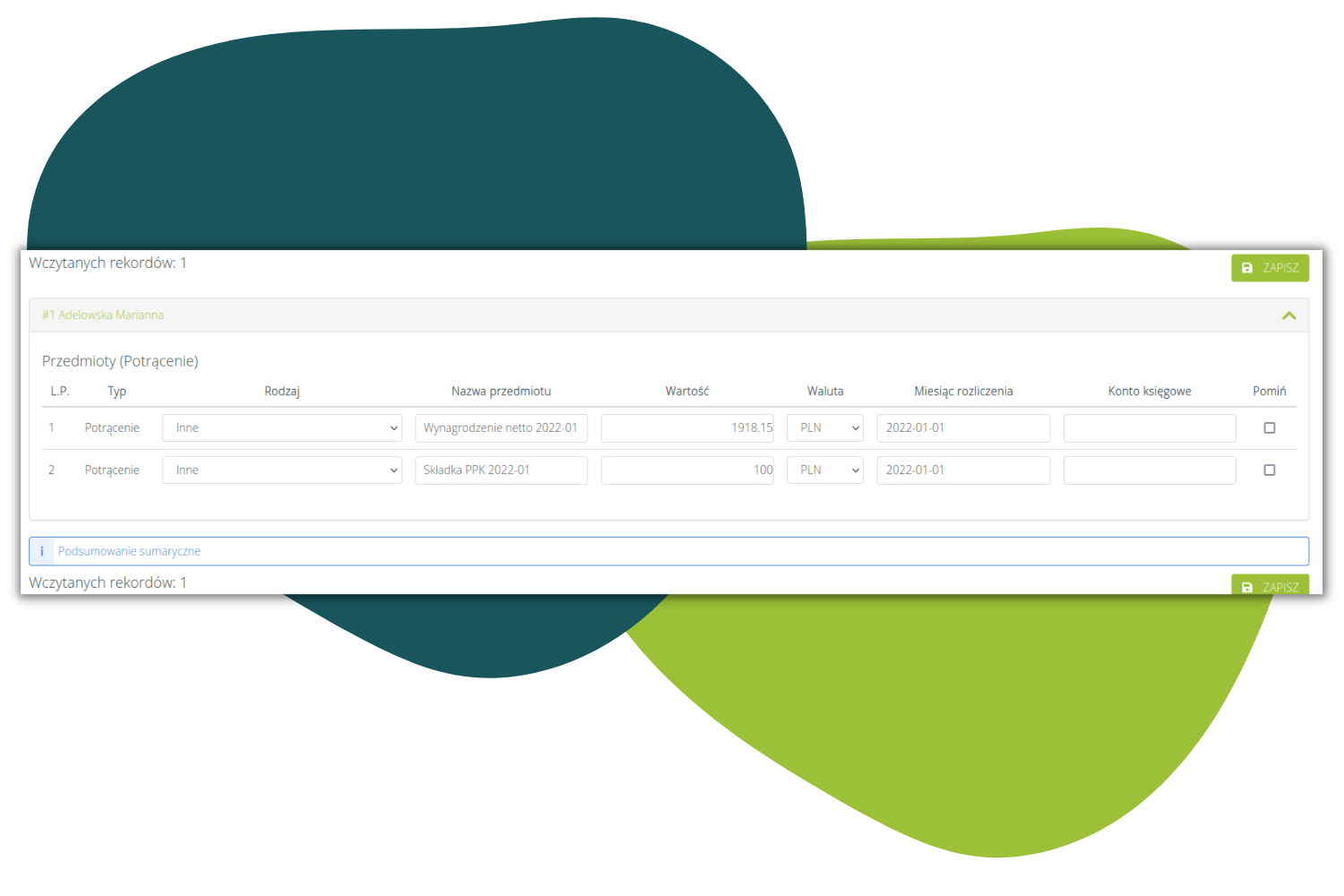 Ustawienia firmy > Import: Import „Lista płac Optima” rozbudowany został o nową kolumnę „Skl_PPKP_Prac” (składka PPK). Na podstawie tej kolumny, pracownikowi tworzy się drugi przedmiot (jako potrącenie) o nazwie „Składka PPK 2022-01”