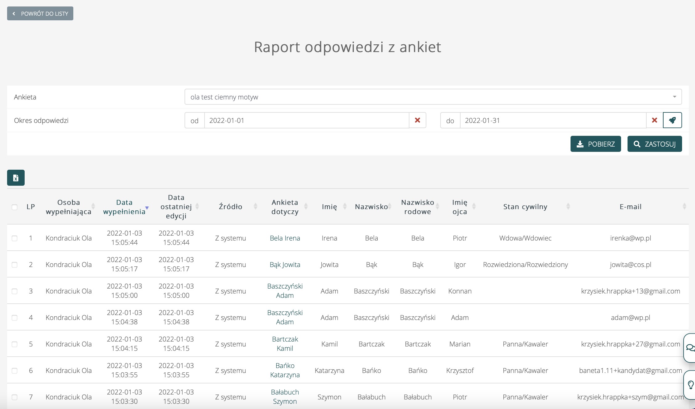 W Raporty w „Raport odpowiedzi z ankiet” obok przycisku „Pobierz” dodana została opcja „Zastosuj”. Po kliknięciu w wybraną ankietę oraz okres, otrzymamy listę wszystkich osób, które wypełniły ankietę.