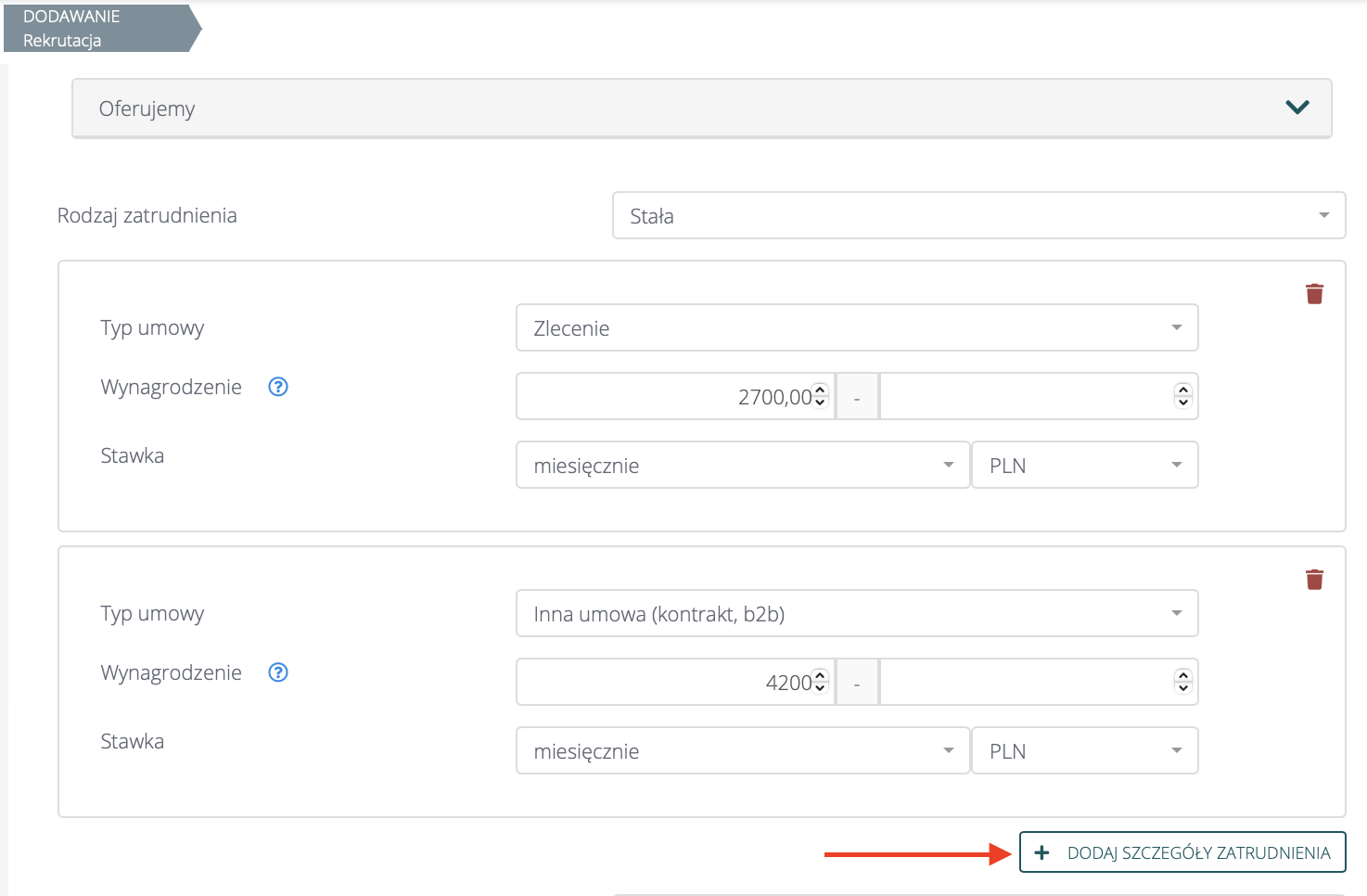 Na formularzu aplikacyjnym dodano możliwość umieszczenia kilku stawek (Rekrutacje > Dodaj rekrutacje) – np. różnych dla umowy o pracę oraz B2B.