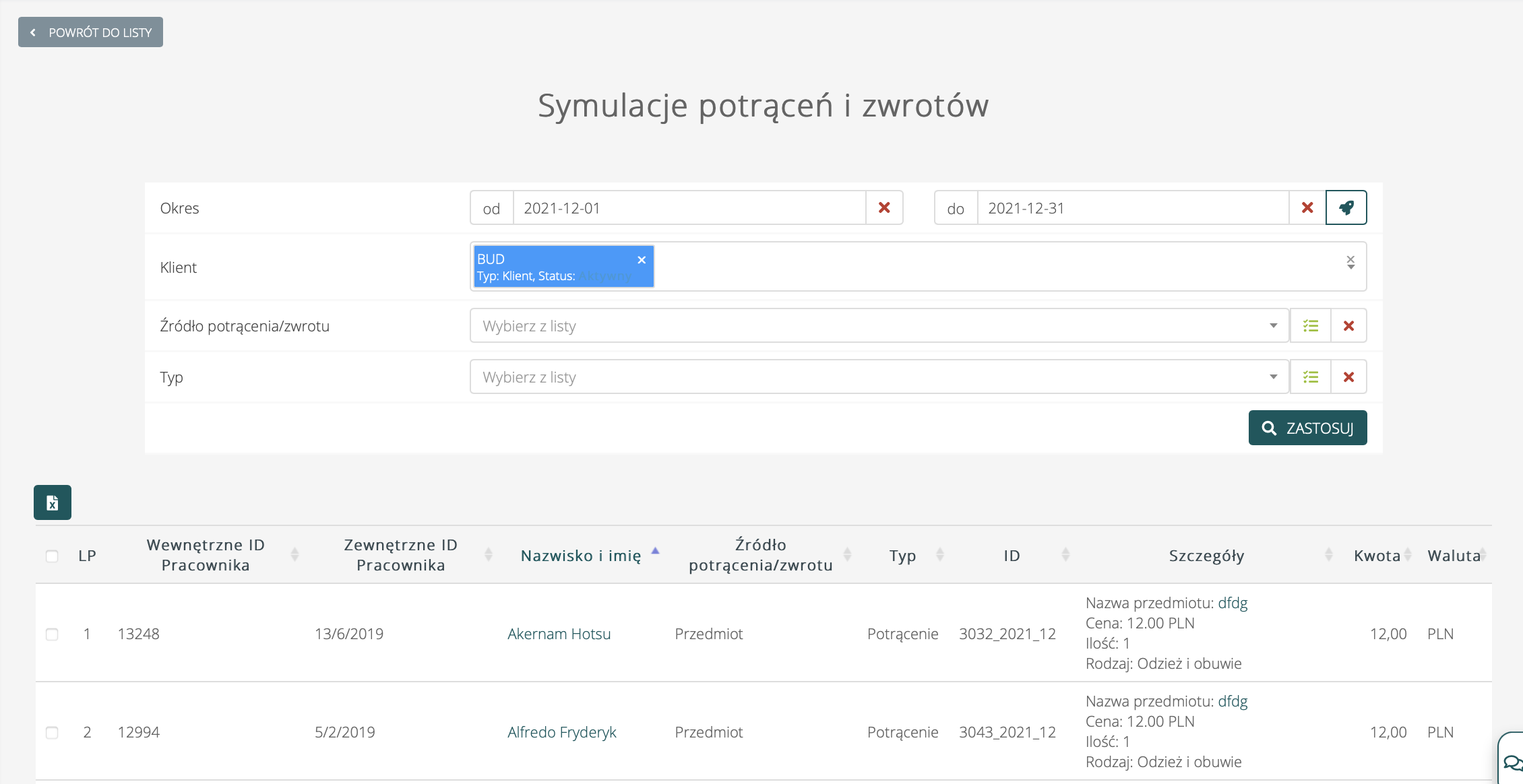 W Raporty dodany został nowy raport „Symulacje potrąceń i zwrotów”, który wykazuje wszystkie nierozliczone potrącenia i zwroty dla wybranego Klienta – w rozbiciu na poszczególnych pracowników.