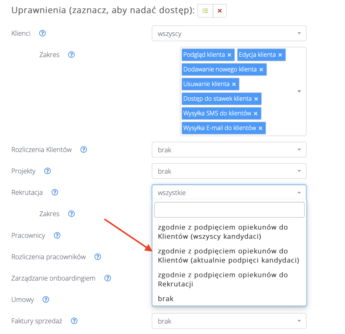 W Ustawienia firmy > Użytkownicy > Użytkownicy > Wybrany użytkownik > Uprawnienia > Rekrutacja, dodane zostało nowe, zwężające uprawnienie „Zgodnie z podpięciem opiekunów do Klientów (aktualnie podpięci kandydaci)”. Po wybraniu tego uprawnienia użytkownik ma dostęp do rekrutacji Klientów, dla których jest opiekunem i widzieć będzie aktualnie powiązanych kandydatów z tym Klientem.
