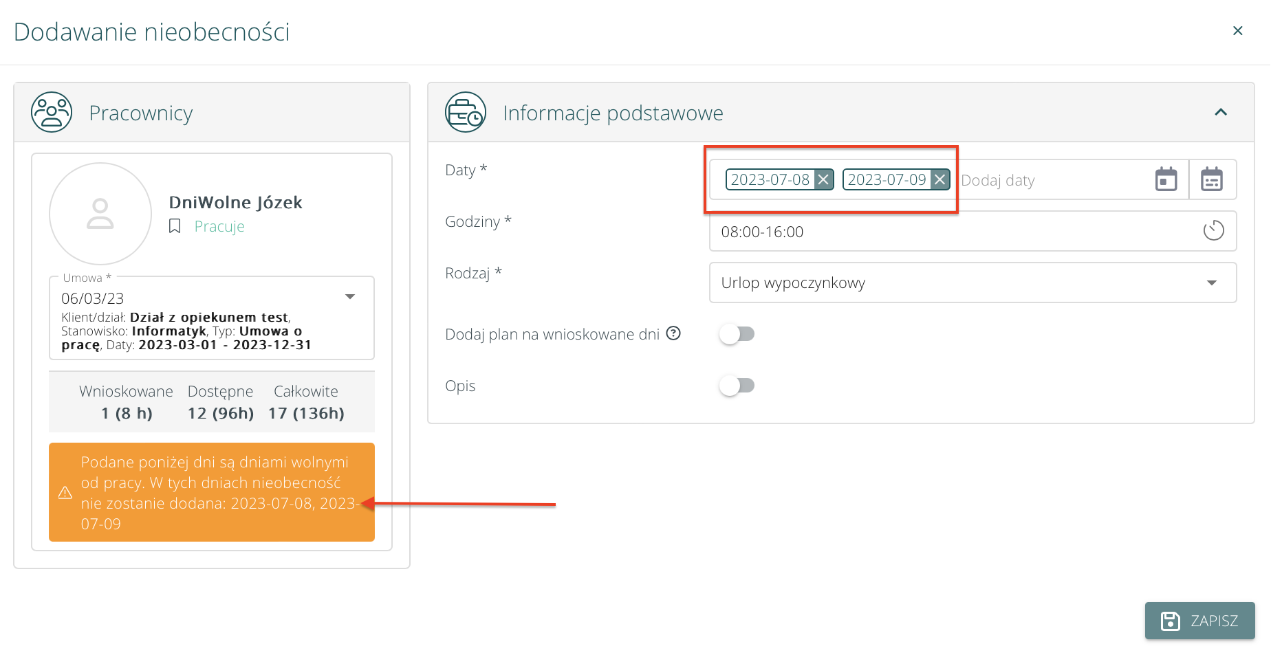 Zmiany w sposobie dodawania nieobecności, które nakładają się na dni wolne #