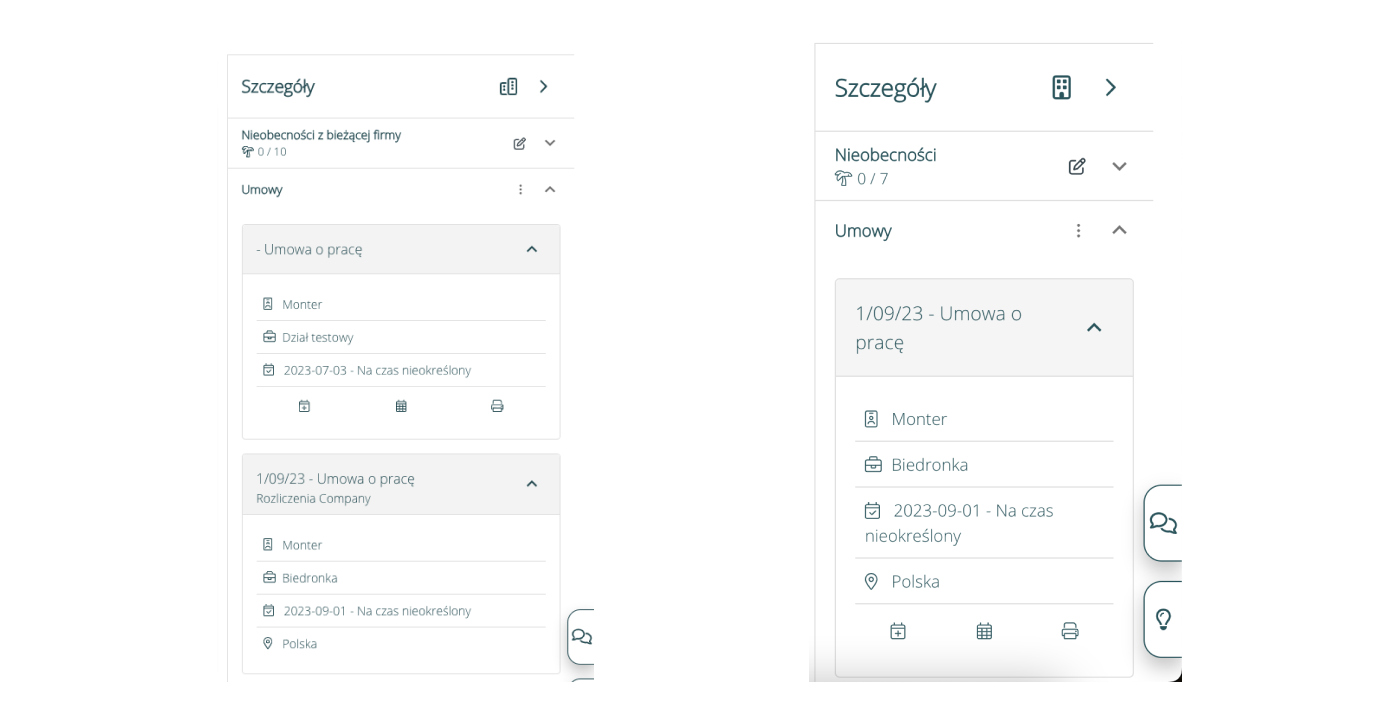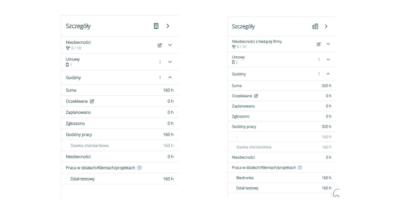 Na grafiku pracownika umożliwiliśmy wyświetlanie „Szczegółów” ze wszystkich firm, z którymi pracownik jest powiązany w systemie. Jeżeli użytkownik posiada dostęp do conajmniej dwóch firm, w których zatrudniony jest wybrany pracownik, będzie mógł wyświetlić informacje z bieżącej firmy (do której jest aktualnie zalogowany) lub sumarycznie ze wszystkich pozostałych firm, do których ma dostęp.