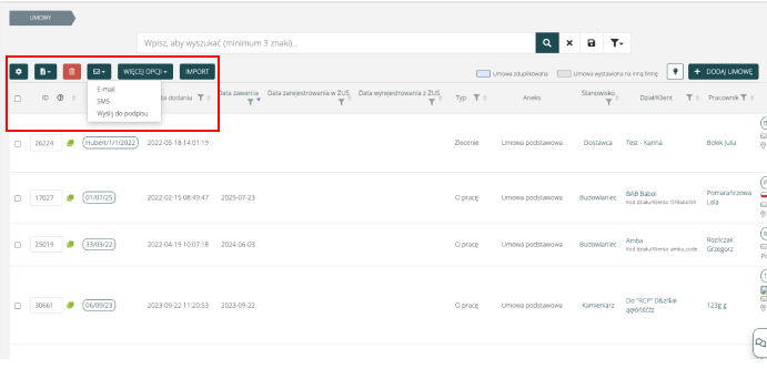 W Pracownicy > Umowy dodaliśmy możliwość masowej wysyłki SMS i wiadomości email do wybranych osób wyświetlonych na liście umów. Użytkownik z poziomu listy umów będzie mógł nie tylko wysyłać umowy pracownikom do podpisu, ale też wysyłać zwykłe wiadomości e-mail/sms np. z przypomnieniem o podpisaniu umowy.