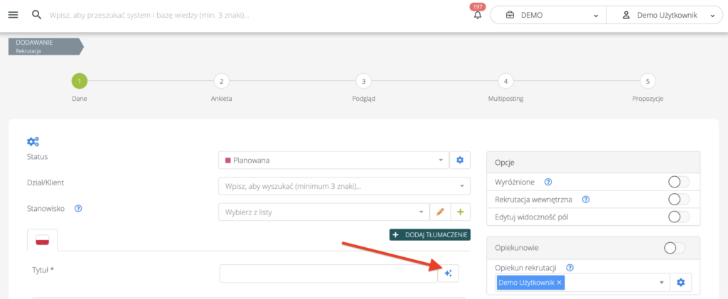 Podczas dodawania rekrutacji przy tytule rekrutacji (oraz podczas dodawania stanowiska, przy nazwie stanowiska) pojawi się ikona gwiazdek, która umożliwia automatyczne wygenerowanie danych stanowiska (opisu stanowiska / wymagań / oferujemy):