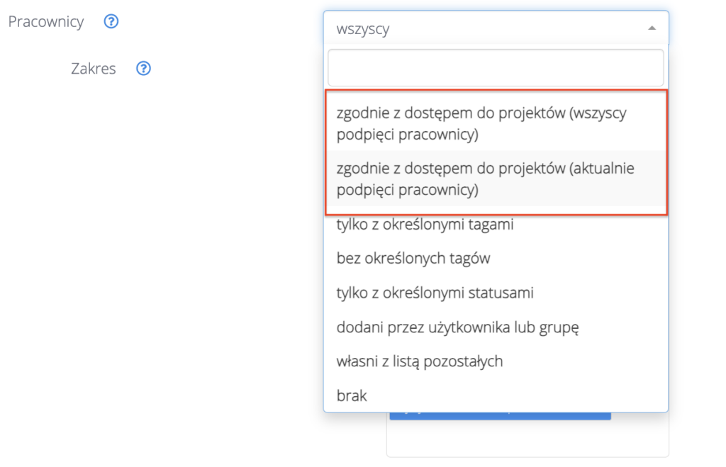 - Zgodnie z dostępem do projektu (wszyscy podpięci pracownicy) – użytkownik będzie miał dostęp do pracowników powiązanych z projektami