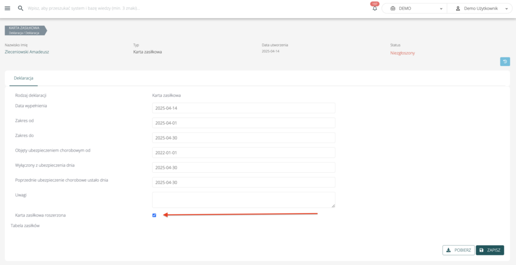 Dodatkowo dodaliśmy opcję „Karta zasiłkowa rozszerzona”. Po jej zaznaczeniu karta poszerza się o podstawę chorobową: