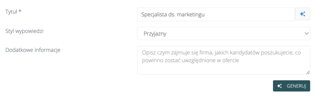 Po kliknięciu w ikonę pojawią się pola, których uzupełnienie pozwoli sztucznej inteligencji wygenerować opis jak najbardziej dopasowany do potrzeb rekrutacji/stanowiska: