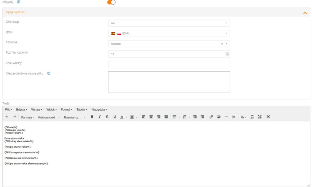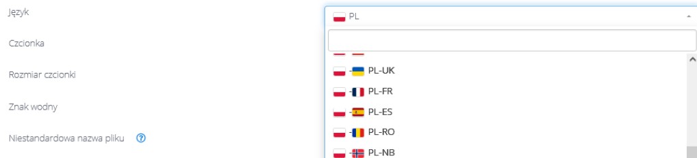 W module Ustawienia > Szablony > Wydruki, w ramach konfiguracji konkretnego szablonu dokumentu dostępna jest opcja ustawienia języka wydruku. Dzięki temu wartości w znacznikach mogą być prezentowane w różnych kombinacjach językowych.