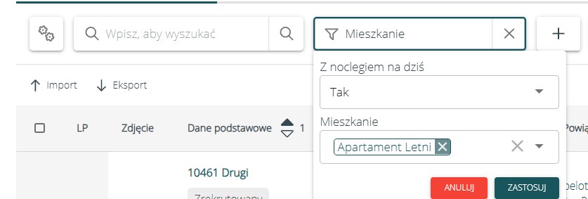 Na liście pracowników został dodany nowy filtr umożliwiający sprawdzenie, czy pracownik jest obecnie zakwaterowany w mieszkaniu. Filtr pozwala wskazać, czy na dzień dzisiejszy pracownik ma przypisane zakwaterowanie, a jeśli tak – można dodatkowo zawęzić wyniki do konkretnego mieszkania.
