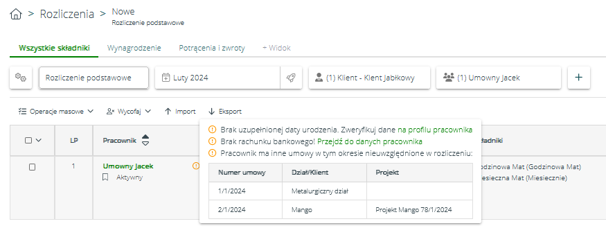 W celu ułatwienia procesu rozliczania pracownika dodaliśmy nowy komunikat informujący o innych umowach. Zostanie on wyświetlony w sytuacji, gdy przystąpimy do rozliczenia pracownika, a system wykryje, że w danym okresie rozliczeniowym pracownik posiada inne umowy.