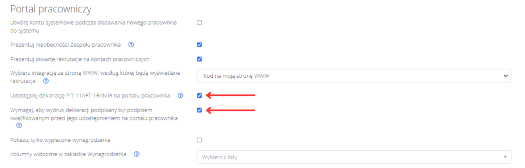 - Aby deklaracja była widoczna na portalu pracownika, w ustawieniach należy włączyć opcję „Udostępnij deklarację PIT-11/IFT-1R/IMIR” w Ustawienia > Moduły > Pracownicy > Portal pracowniczy. Wtedy na portalu pojawią się wszystkie deklaracje IMIR pracownika.