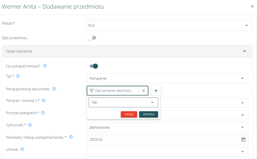 Dodawanie przedmiotu do pracownika: nowa opcja „Zatrudnienie zakończone” w polu „Potrącaj zwracaj warunkowo” #