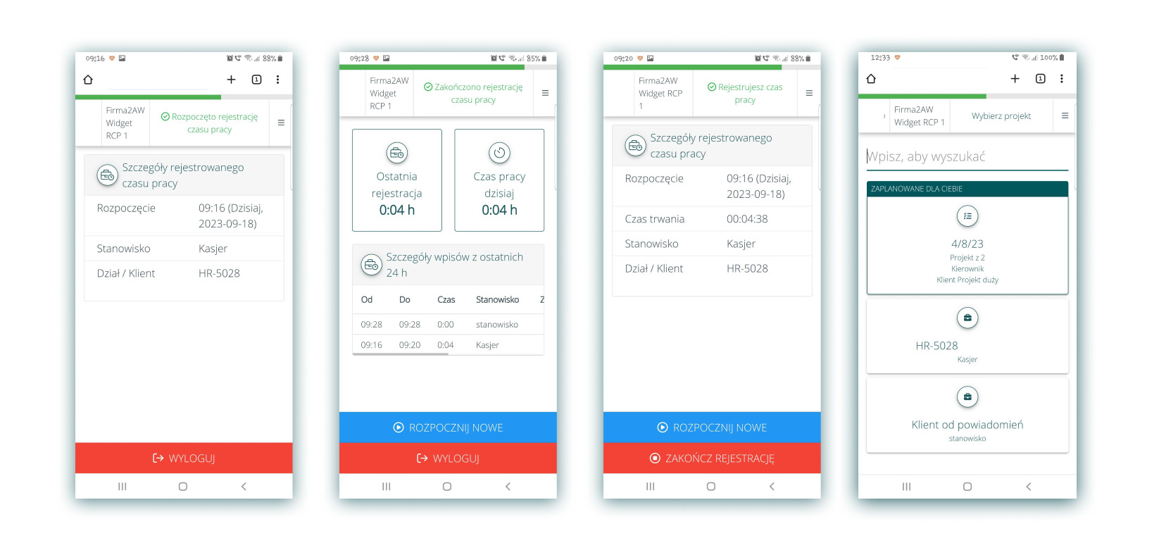 Dostosowaliśmy widok widgetu Rejestracji Czasu Pracy do wersji mobilnej. Teraz po wysyłce linku (Ustawienia > Moduły > Pracownicy > Link do widgetu RCP) pracownik (lub inna osoba rejestrująca czas pracy) będzie mógł poprawnie wyświetlić widget na swoim telefonie w dowolnej orientacji ekranu.