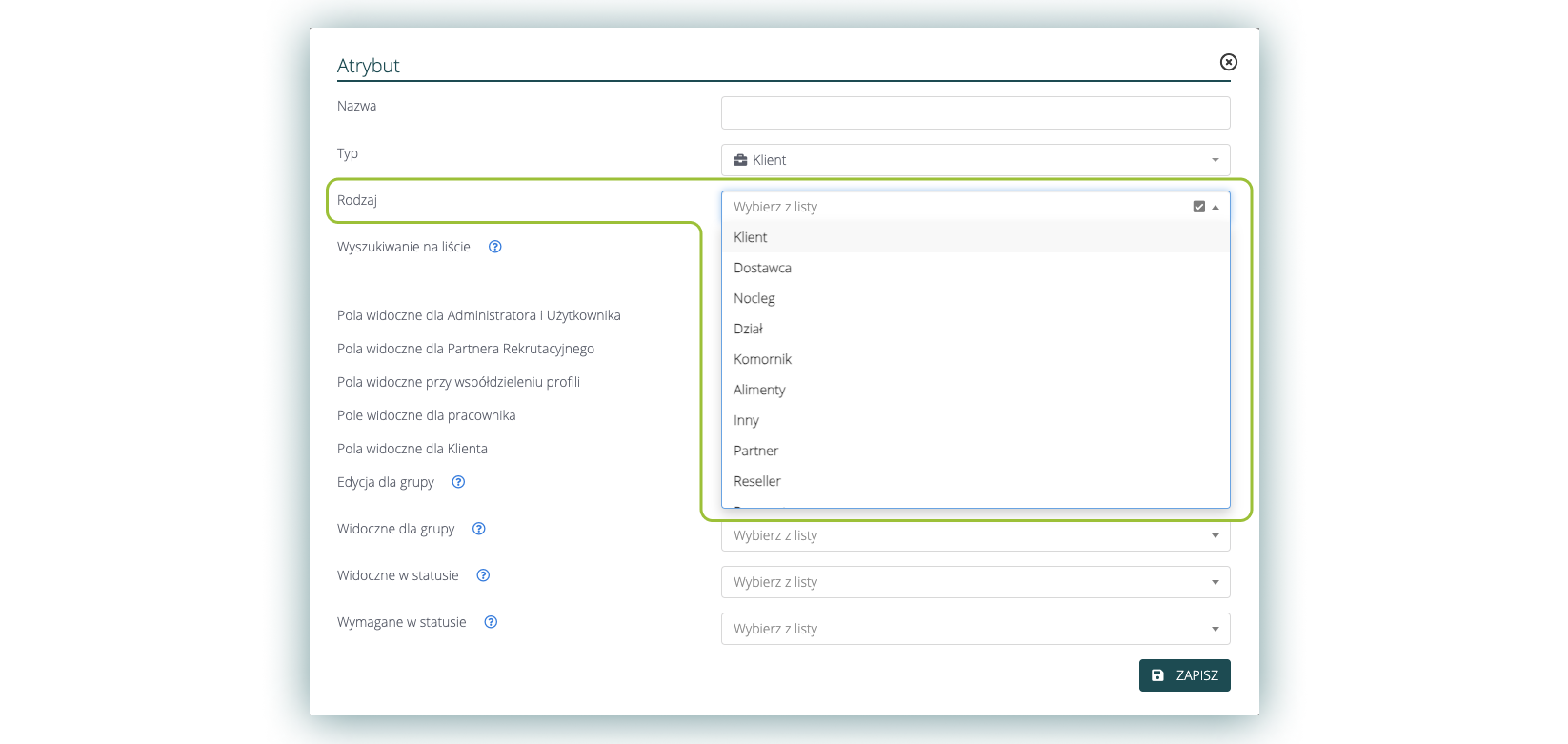 W Ustawienia > Formularze w dowolnej zakładce podczas dodawania lub edycji atrybutu o typie Klient dodaliśmy nowe pole „Rodzaj”. Po rozwinięciu listy użytkownik będzie miał możliwość wyboru dowolnego rodzaju Klienta, który zawęzi pokazywane rekordy do wskazanego jednego lub wielu rodzajów.