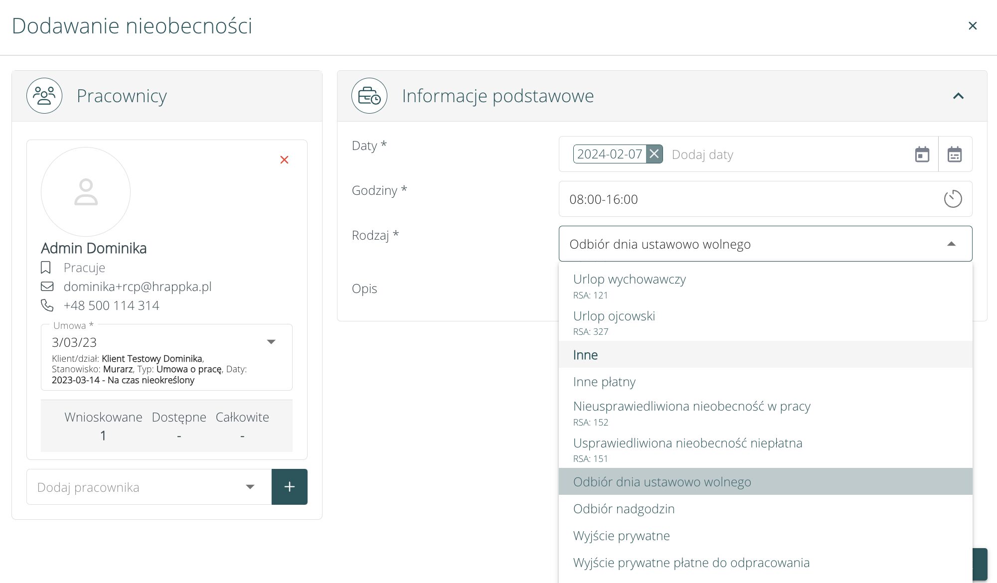 Dodaliśmy możliwość przyznawania pracownikowi nieobecności o typie „Odbiór dnia ustawowo wolnego”. Służy on do odbioru godzin np. za święta ustawowo wolne wypadające w sobotę.
