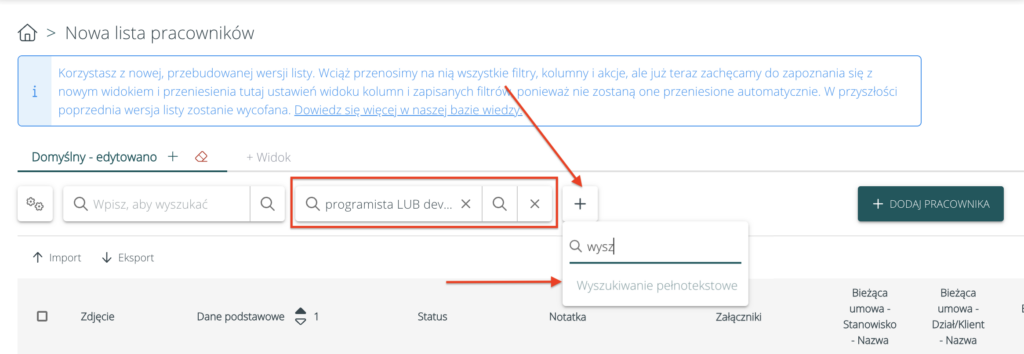 Na nowej liście pracowników (a wkrótce również na pozostałych nowych listach w systemie) dodaliśmy możliwość tzn. boolean search, czyli zaawansowanego wyszukiwania rekordów przy wykorzystaniu operatorów ORAZ, LUB, NIE (tłumaczonych na język interfejsu operatora).