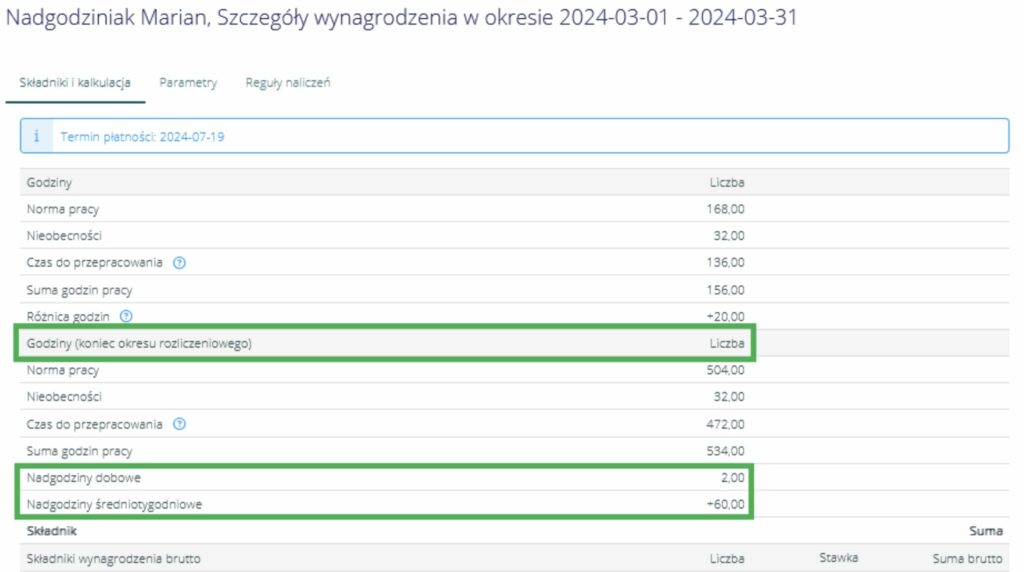 W celu poprawy przejrzystości naliczania nadgodzin średniotygodniowych dodaliśmy w szczegółach wynagrodzenia pracownika w zakładce „Składniki i kalkulacja” dodatkowe informacje dotyczące nadgodzin. W sekcji „Godziny (koniec okresu rozliczeniowego)” umieściliśmy informację na temat nadgodzin dobowych i nadgodzin średniotygodniowych.