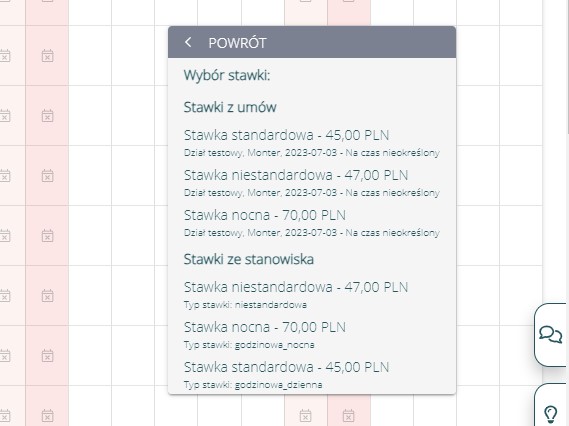 W oknie wyboru stawki, podczas dodawania planu pracy na wybrane zapotrzebowanie, wyświetlana będzie dodatkowa informacja o nazwie typu stawki dla stawek indywidualnych i stanowiskowych.