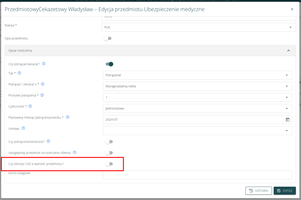 Informacja będzie zawsze wyświetlona zarówno na liście przedmiotów (Pracownicy ➞ Przedmioty lub na liście przedmiotów przypisanych do konkretnego pracownika) a także na rozliczeniu przy w konkretnym przedmiocie. Ustawienie pozwala obniżyć lub podwyższyć CKZ o wartość przedmiotu.