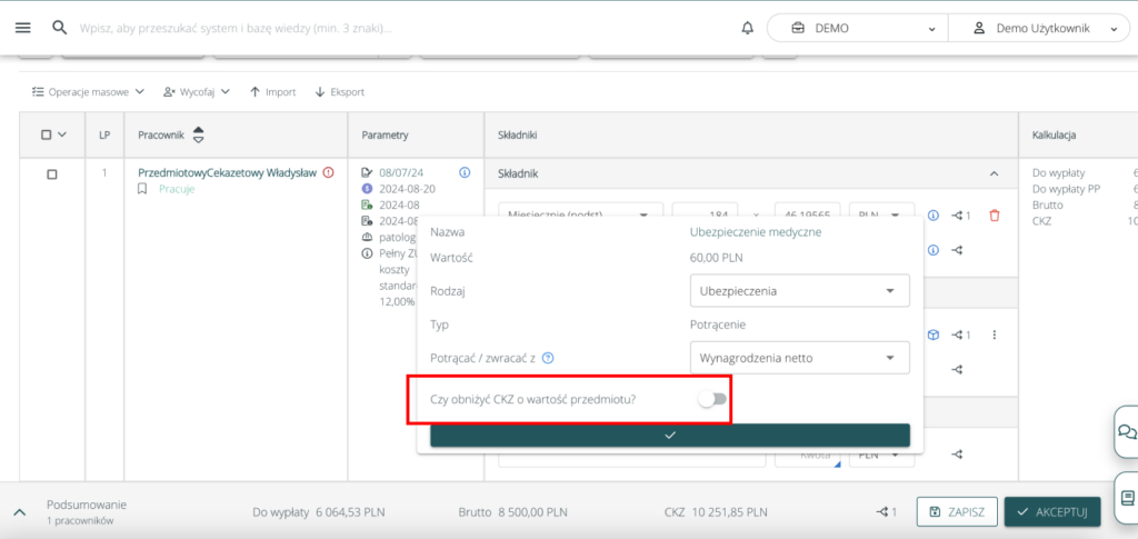 Na formularzu przedmiotu oraz na formularzu definicji przedmiotu dodaliśmy nowe pole dotyczące wpływu wybranego potrącenia / zwrotu / dodatku na całkowity koszt zatrudnienia.