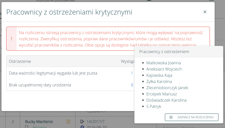Ostrzeżenia krytyczne na rozliczeniu pracownika #