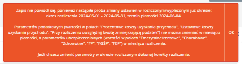 W takiej sytuacji system pozwoli zmienić od czerwca tylko elementy sprawdzane po dacie rozliczenia (Emerytalne/rentowe, Chorobowe, Zdrowotne, FP, FGŚP, FEP) a nie pozwoli zmienić wartości w polu “Procentowe koszty uzyskania przychodu” oraz “Przy rozliczeniu uwzględnij kwotę zmniejszającą podatek”. W przypadku błędu wyświetlony zostanie specjalny komunikat: