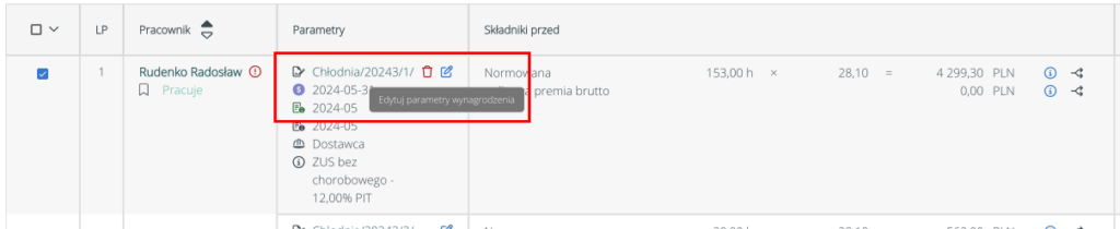 Podczas wykonywania korekty rozliczenia, w kolumnie „Parametry” zmieniona została ikona znajdująca się w prawym górnym rogu z „Informacja” na „Edycja”