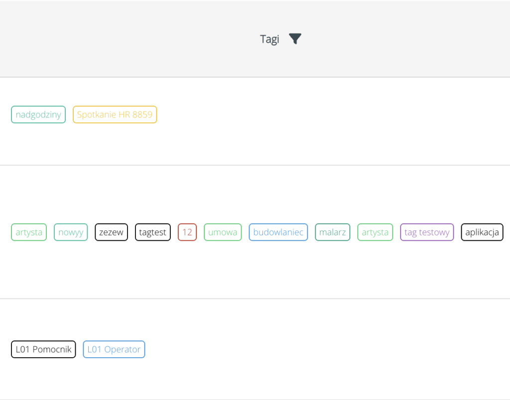 Na nowej liście pracowników dostępne są już różne kolory tagów. Można je definiować podczas dodawania tagu np. na pracowniku.