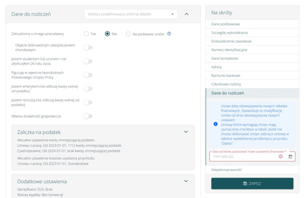 Zmieniono rozmieszczenie pól w sekcji Dane do rozliczeń. Dotychczas ukryte pola m.in:
