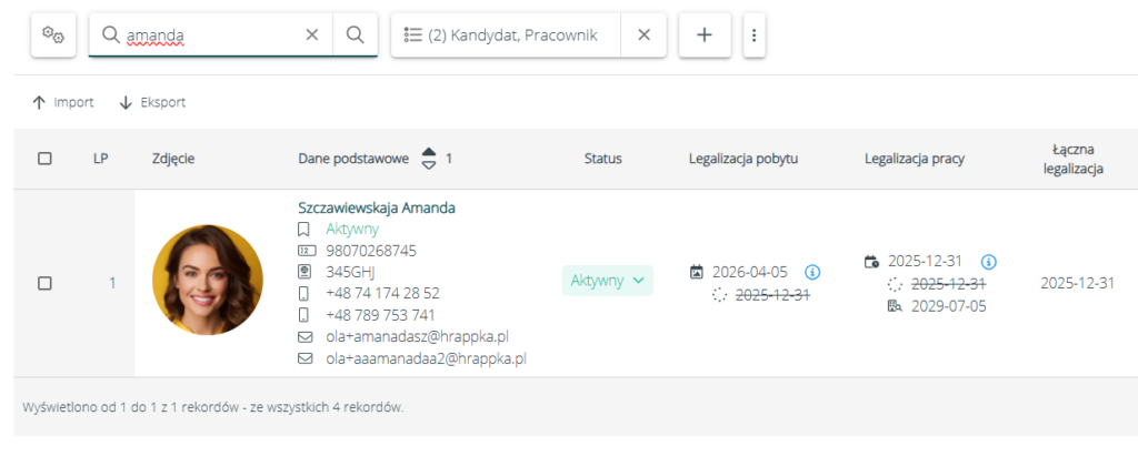 Kolumny te wyświetlają informacje dotyczące legalizacji w kontekście konkretnej firmy na której jesteśmy zalogowani. Dzięki temu możliwa jest precyzyjna kontrola statusu legalizacji zarówno pobytu, jak i pracy, z uwzględnieniem firmy, której dotyczą dokumenty.