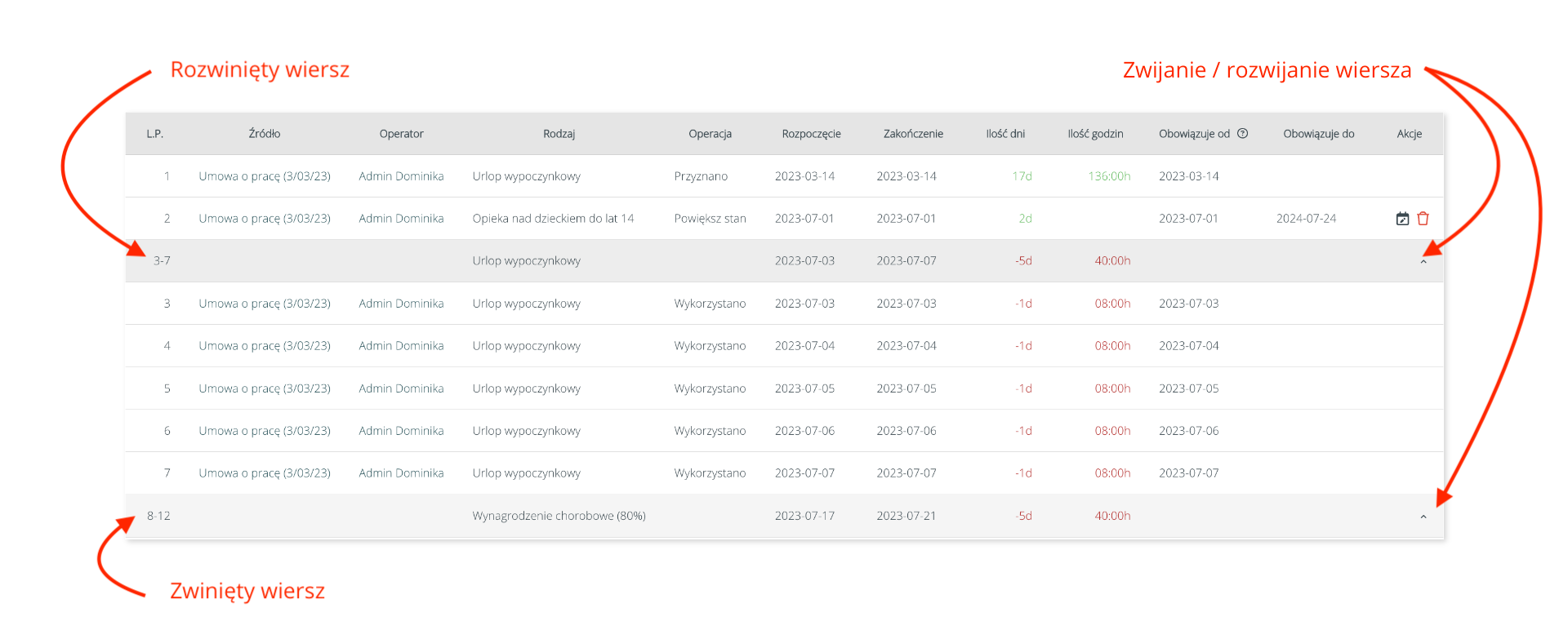 - W celu poprawy przejrzystości widoku i sprawniejszej weryfikacji nieobecności pracownika, powiązane wpisy grafikowe wykazane na liście zostały zwinięte w jeden wiersz. Oznacza to, że jeżeli pracownik zgłosi 7 dni nieobecności, to zostanie to wykazane na liście jako jeden wiersz, który możemy rozwinąć klikając z ikonę strzałki w dół w kolumnie akcje (dotychczas każdy dzień był w osobnym wierszu).