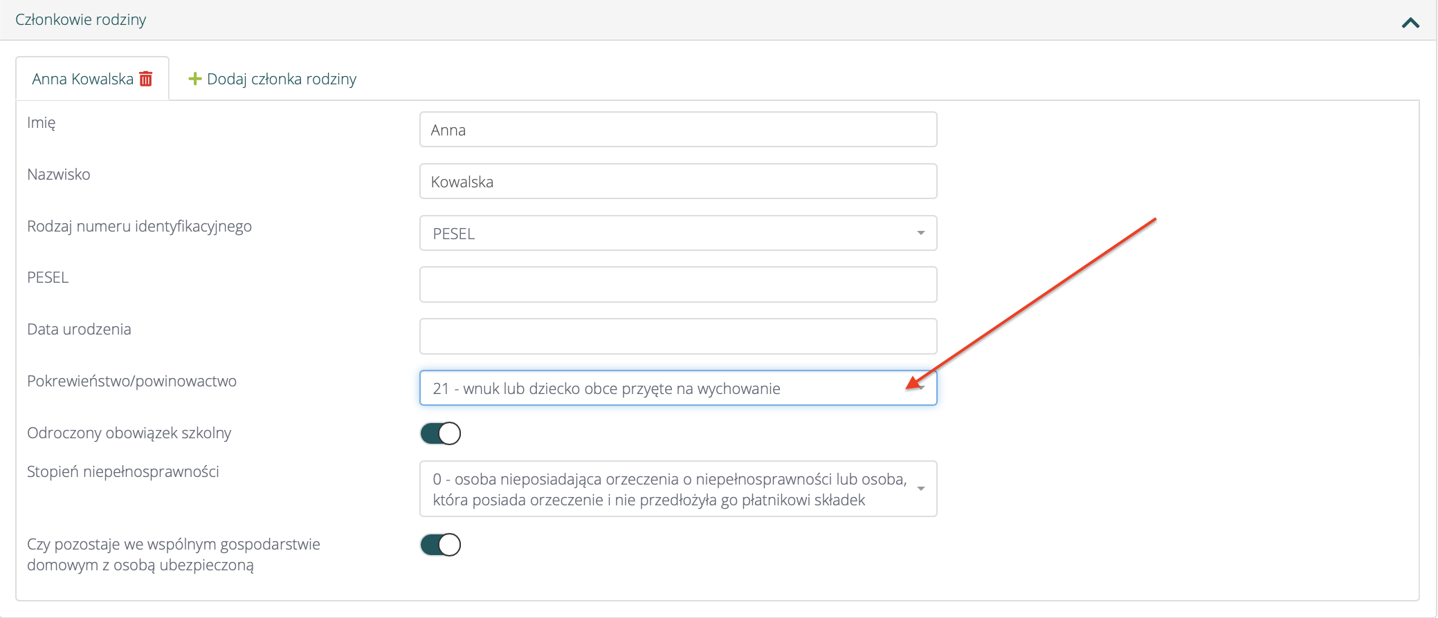 Natomiast jeżeli w polu „Pokrewieństwo/powinowactwo” wybierzemy „21 – wnuk lub obce dziecko przyjęte na wychowanie”, pojawia się nowa opcja „”Odroczony obowiązek szkolny”: