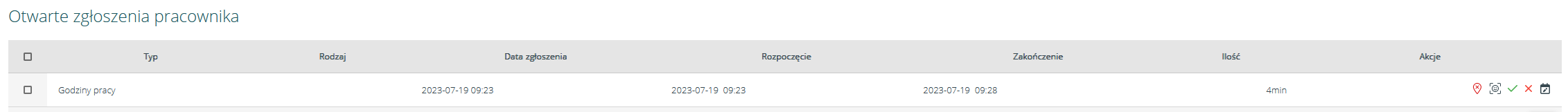 Na otwartych zgłoszeniach pracownika, w kolumnie akcje, widoczna jest ikonka lokalizacji oraz zdjęcia: