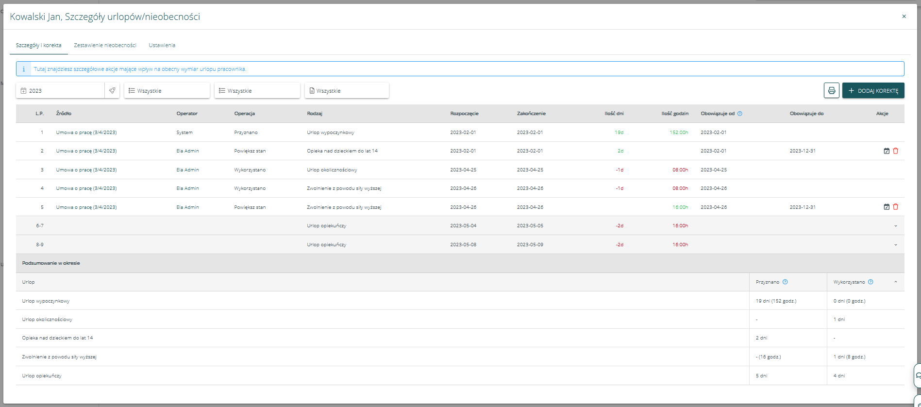 Istotną zmianą jest zaliczenie poszczególnych operacji do danych zebranych w kolumnie Przyznano oraz Wykorzystano. Mowa tu o kolumnach widocznych w podsumowaniu na zakładce Szczegóły i korekta oraz na zakładce Zestawienie nieobecności. Operacje wchodzące w skład tych kolumn wylistowane są w tooltipach znajdujących się w tych kolumnach. Zmiana w przyporządkowaniu operacji wpływa na wartości wyświetlane w panelu bocznym widocznym z poziomu grafiku.- Operacje wchodzące w skład urlopu przyznanego: