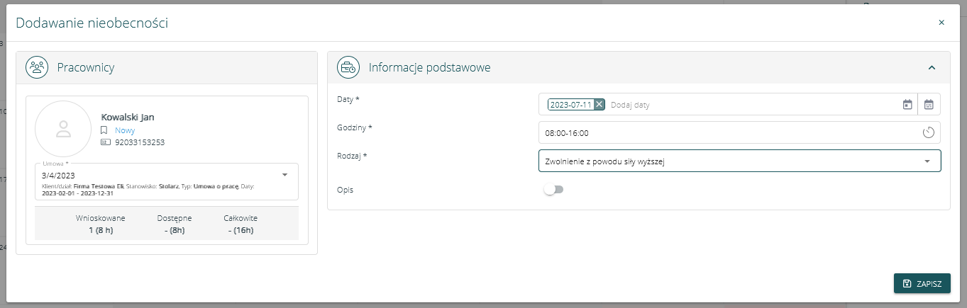 - Operacja – pozwala wybrać typ operacji na nieobecnościach i do wyboru jest: