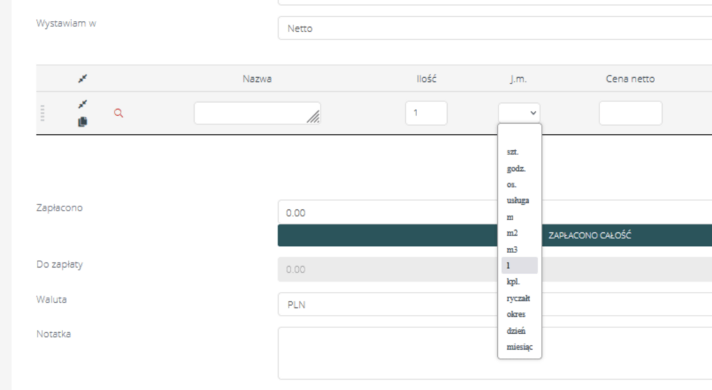 Na fakturze dodaliśmy nową jednostka miary na fakturze – litr (l).