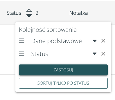 Na nowych listach ustawione jest domyślne sortowanie po jednej z wybranych kolumn. Po kliknięciu w ikonę sortowania (na kolumnie, po której lista nie jest sortowana), wyświetlona zostanie konfiguracja sortowania – lista kolumn, po których sortowana jest lista oraz kolejność i kierunek sortowania: