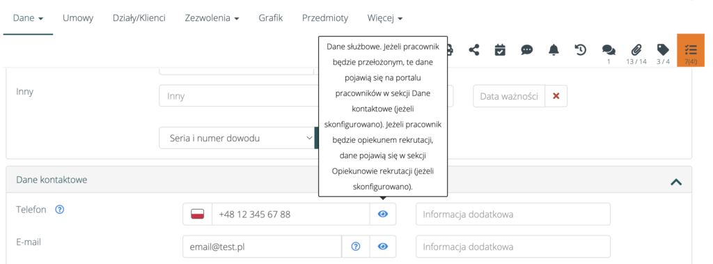 Aby to zrobić należy przejść na profil pracownika i w sekcji Dane kontaktowe na wysokości Telefonu i E-mail kliknąć w ikonę oka. Nieprzekreślona ikona, oznacza, że numer traktowany jest jako numer służbowy. Z kolei przekreślona, że jest to numer prywatny.