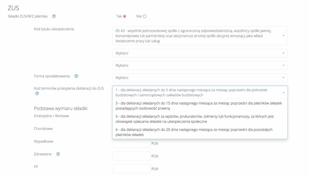 W Ustawienia > Dane firmy > Ustawienia finansowe umożliwiliśmy wybór kodu terminu przesłania deklaracji do ZUS bez względu na wybór „Formy prawnej prowadzonej działalności gospodarczej”. Dotychczas kod terminu deklaracji, dostępny był tylko dla osób fizycznych prowadzących działalność gospodarczą.