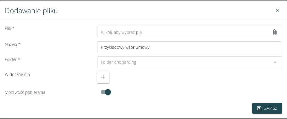 Administratorzy będą mieli możliwość edycji bazy poprzez dodawanie folderów i plików, zmianę nazwy, a także zawężania widoczności dla wybranych firm, działów / Klientów, grup, ról, tagów czy też typu umowy. Aby to zrobić należy wybrać filtry poprzez kliknięcie ikony plusa w polu „Widoczne dla”. Podczas dodawania administratorzy zdecydują również o możliwości pobierania pliku przez pracowników.
